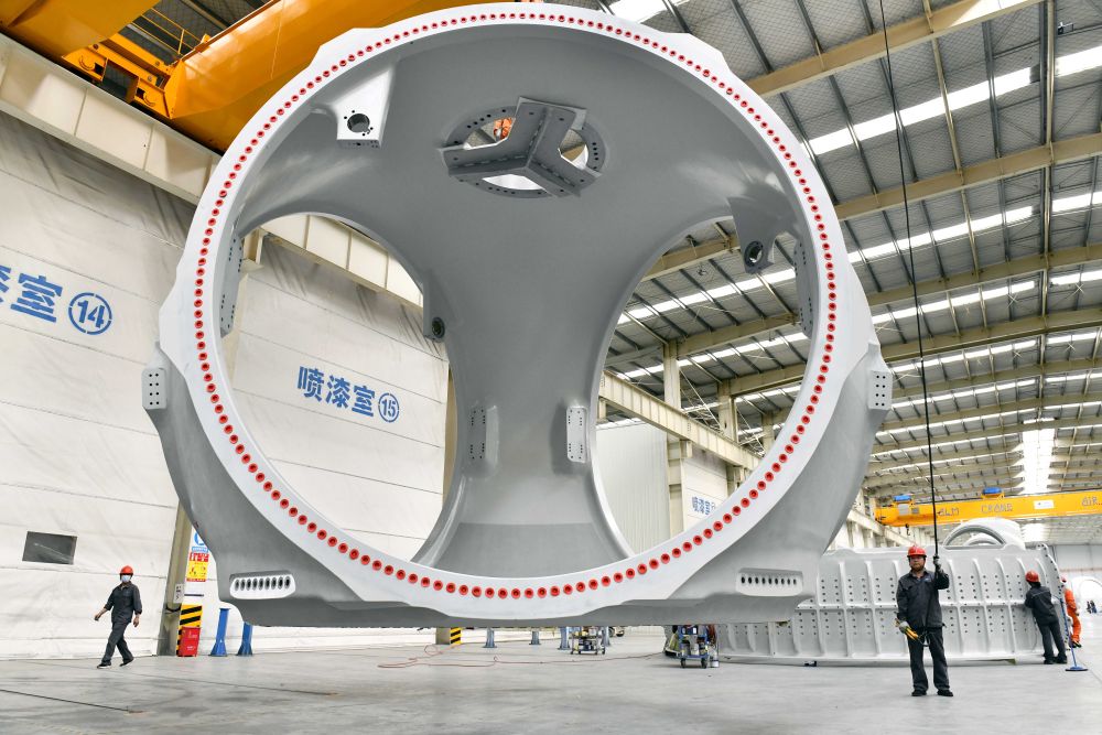 工作人員在山東省惠民縣風電裝備產業(yè)基地一涂裝車間內作業(yè)(2022年6月7日攝)。新華社記者 郭緒雷 攝