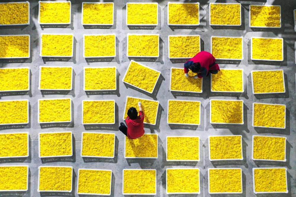 村民在貴州省貴定縣云霧鎮(zhèn)一菊花加工車間攤晾金絲皇菊(2022年10月20日攝,無人機照片)。新華社記者 楊文斌 攝