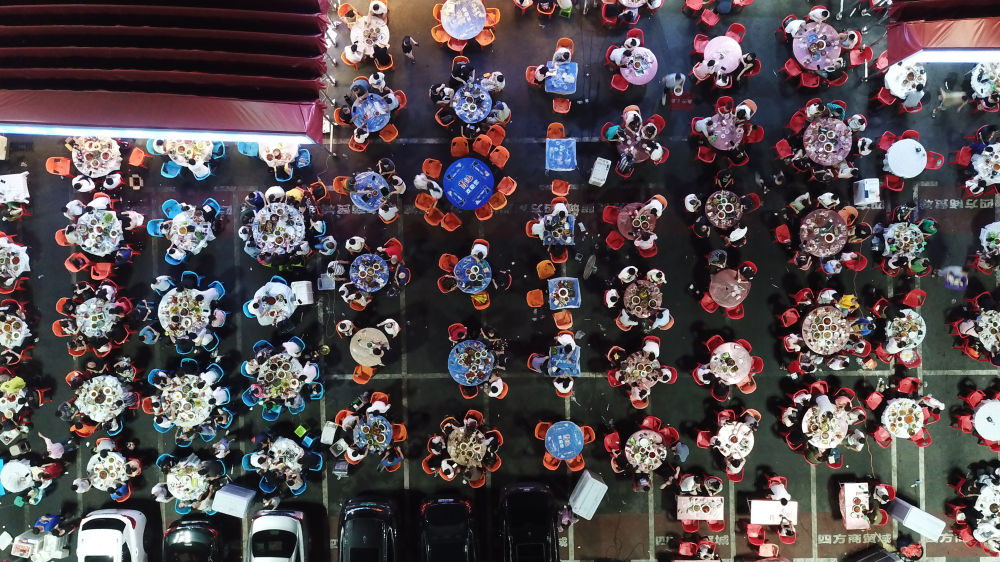 游客在湖南長沙四方坪夜市就餐(2022年7月29日攝,無人機照片)。新華社記者 陳振海 攝
