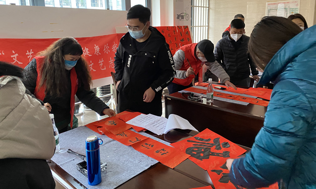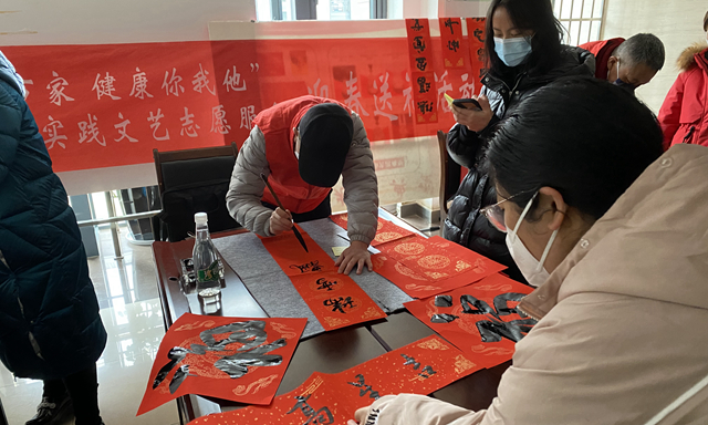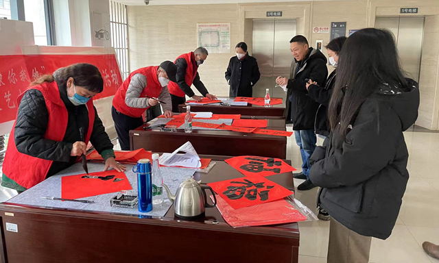 活動(dòng)現(xiàn)場(chǎng)氣氛熱烈,歡聲笑語四處洋溢,紅紙鋪開,取筆蘸墨,揮毫?xí)鴮?,一幅幅蘊(yùn)含著美好寓意的春聯(lián),一個(gè)個(gè)不同書體的“?!弊郑瑩]毫潑墨間,濃濃的新春祝福凝聚在筆端。有的干部職工還向書法家協(xié)會(huì)的老師們現(xiàn)場(chǎng)“點(diǎn)單”或者親自提筆上陣,將喜歡的內(nèi)容通過書寫春聯(lián)體現(xiàn)出來。