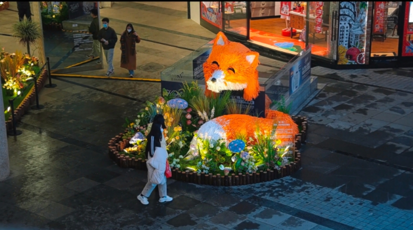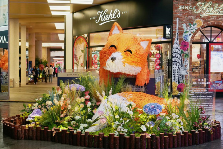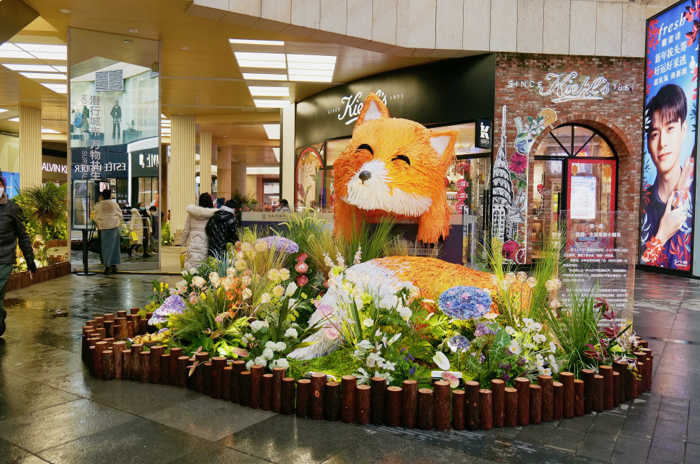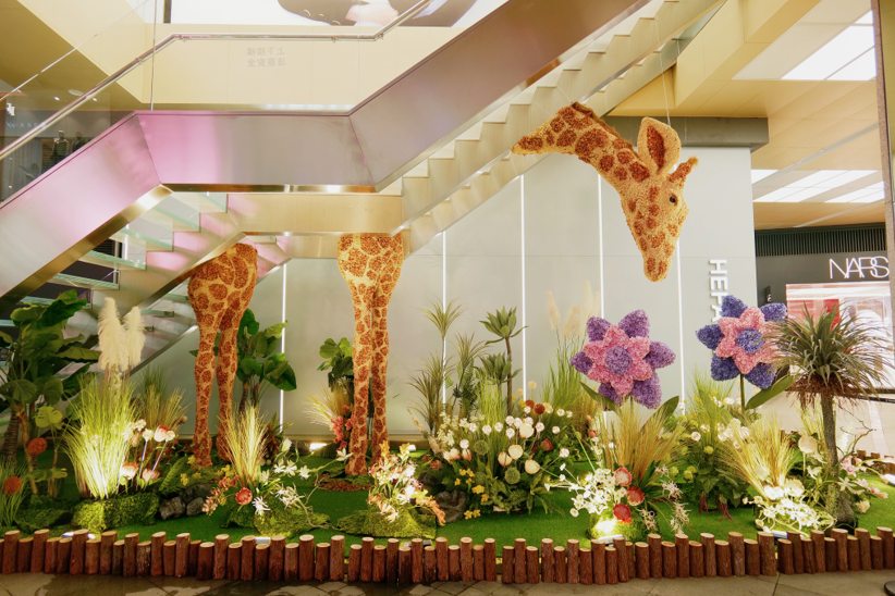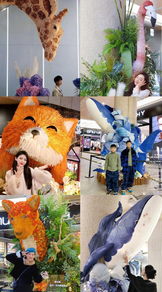 2023年伊始,在順城購(gòu)物中心美妝街周圍出現(xiàn)了許多“巨型動(dòng)物”:巨大的長(zhǎng)頸鹿、狐貍、鯨、火烈鳥、美洲豹依次進(jìn)入人們的視野,自然茂密的植被纏繞著城市的建筑,這些突然出現(xiàn)的動(dòng)物用花植材料掩護(hù)著自己在城市之間穿行,引來(lái)許多市民在此駐足拍照。