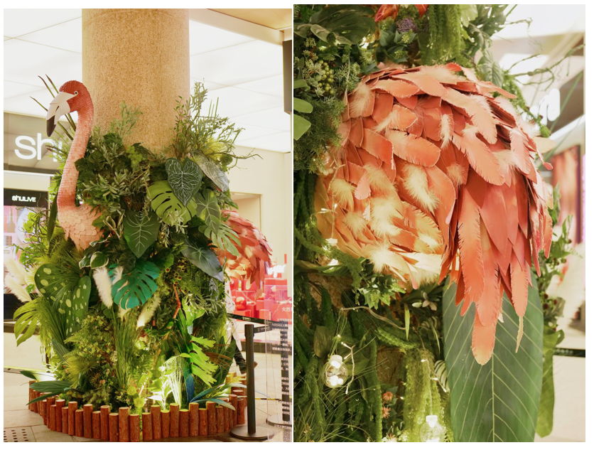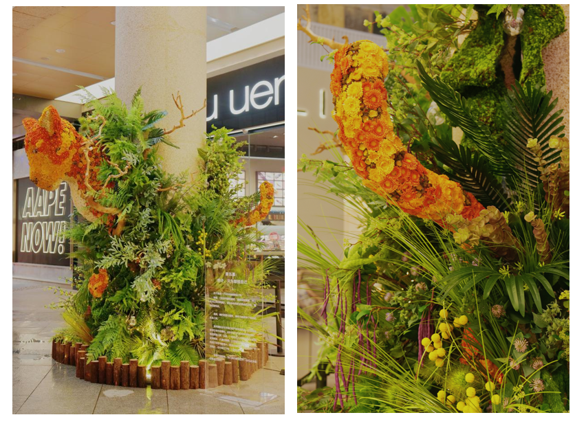據(jù)順城購(gòu)物中心相關(guān)負(fù)責(zé)人介紹,本次環(huán)保展一共有5種極具代表性的動(dòng)物,都是用花植材料和環(huán)保材料來(lái)呈現(xiàn)的。我們?cè)诂F(xiàn)場(chǎng)偶遇樓梯下溫柔優(yōu)雅的長(zhǎng)頸鹿,在地面連接處碰見探出頭的好奇狐貍,還有在柱子上欲越出海面的鯨魚、枝繁葉茂的植被中小心躲藏的火烈鳥、隱藏在叢林中時(shí)刻準(zhǔn)備出擊的豹子,仿佛闖入了大自然深處的世界。