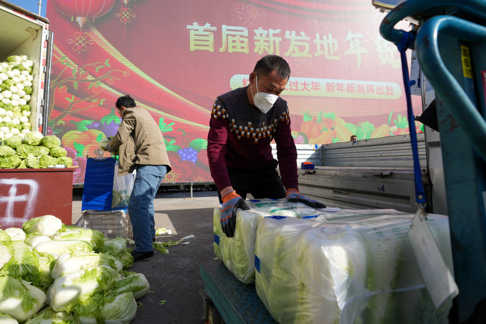 1月18日,在北京新發(fā)地農(nóng)產(chǎn)品批發(fā)市場(chǎng),工作人員將蔬菜裝車準(zhǔn)備轉(zhuǎn)運(yùn)。新華社記者 鞠煥宗 攝