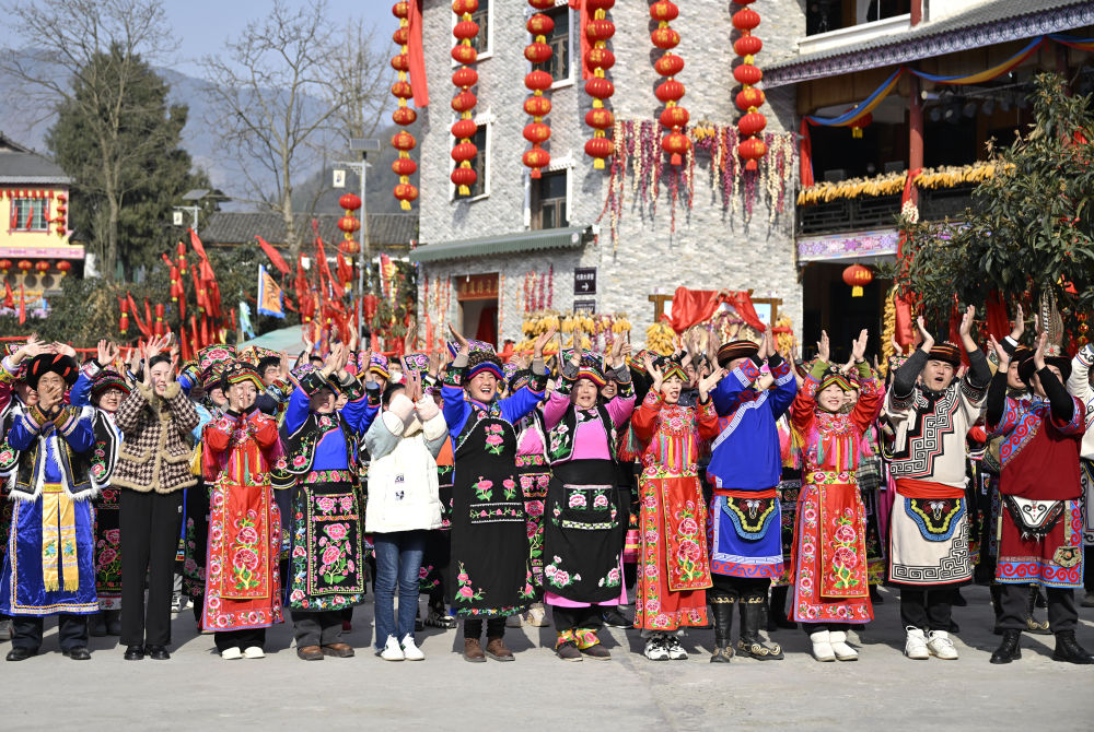 1月18日,四川省綿陽(yáng)市北川羌族自治縣石椅村的鄉(xiāng)親們和游客同習(xí)近平總書(shū)記視頻連線。新華社記者 殷博古 攝
