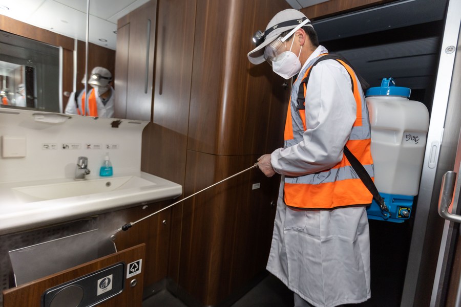 1月16日,工作人員在列車內(nèi)進(jìn)行消毒作業(yè)。(新華社記者王翔攝)