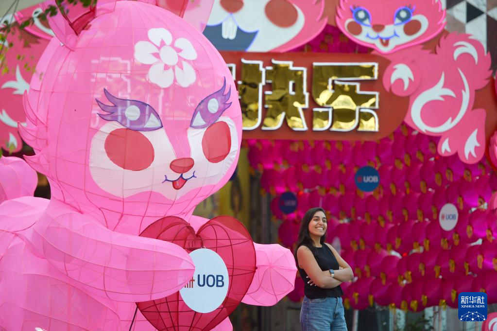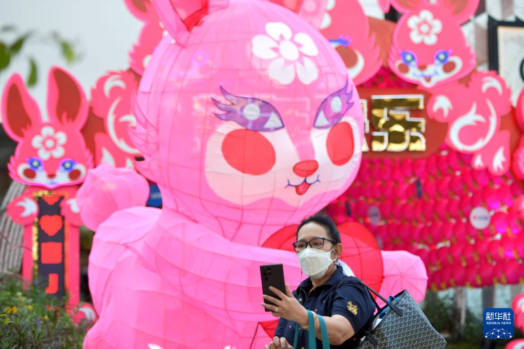 1月18日,一名女子在泰國(guó)曼谷一家商場(chǎng)前與兔年裝飾合影。新華社發(fā)(拉亨攝)