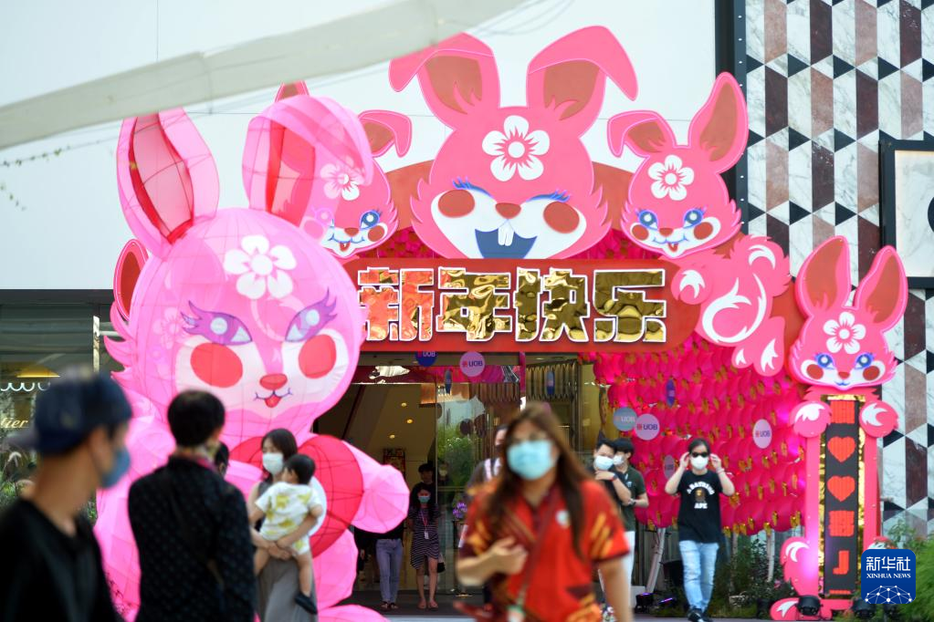 1月18日,行人走過(guò)泰國(guó)曼谷一家商場(chǎng)前的兔年裝飾。新華社發(fā)(拉亨攝)