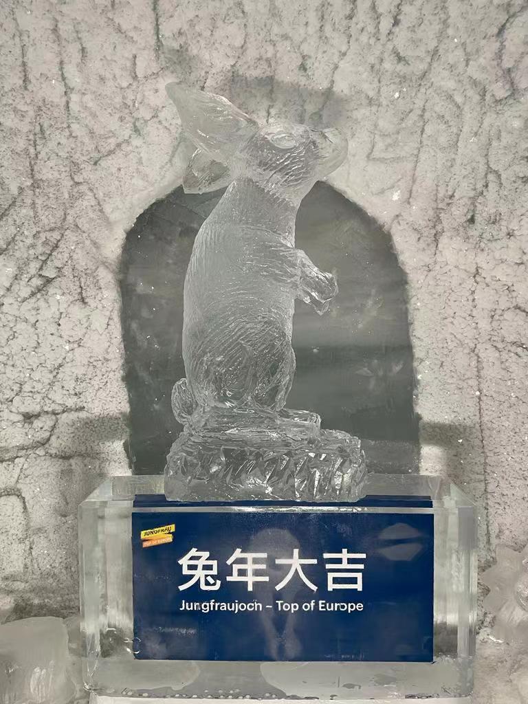 冰雕兔就在歐洲海拔最高的火車站“少女峰-歐洲屋脊”旁邊的冰雕區(qū)域內(nèi)展出,冰雕下附中文祝福語(yǔ)“兔年大吉”。