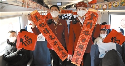 北京客運段用心用情做好京唐京濱城際鐵路開通后的第一個春運乘務(wù)組織工作,車內(nèi)開展送春聯(lián)、送“?!弊值榷鄻踊顒樱屄每统塑圀w驗更美好。