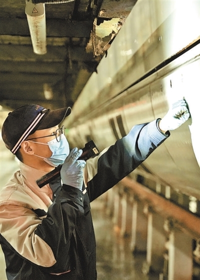 廣州動車段長沙動車運用所動車組機械師正對動車組兩側(cè)裙板進行檢查。