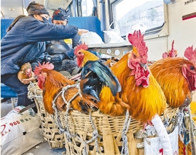 在普雄至攀枝花南的5633次公益慢火車上,村民帶著收購的雞到西昌販賣。5633次列車沿途???6個站,被稱為大涼山的“致富線”。