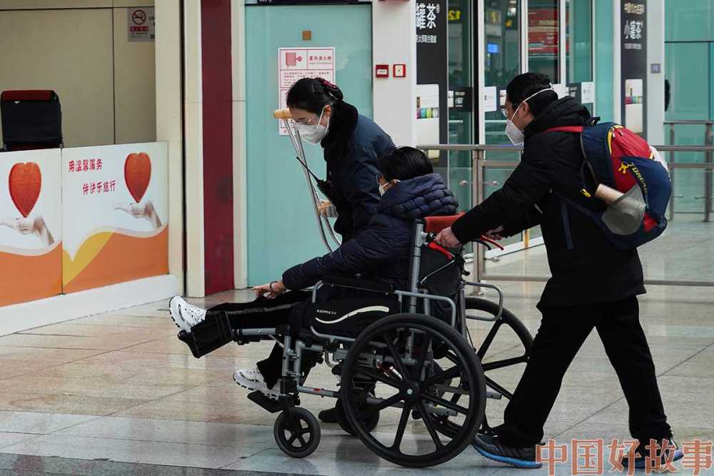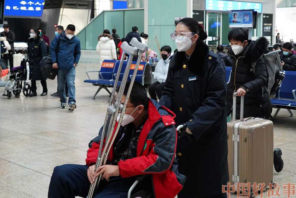 2023年1月10日,北京南站工作人員為旅客提供愛心服務。