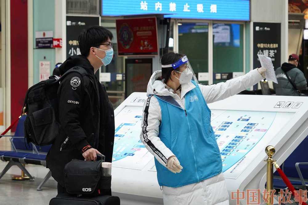 2023年1月10日,北京南站愛心服務臺工作人員為旅客提供即時幫助。