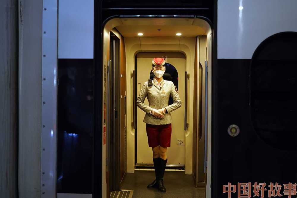 2023年1月11日,北京南站,列車乘務員等候旅客上車。