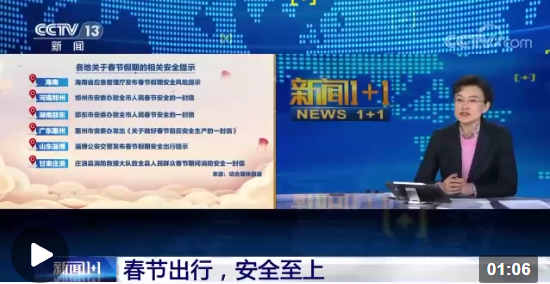 今年春節(jié)回家多,回家選擇自駕多,自駕安全隱患多。今年春節(jié)旅游多,旅游景點游客多,出游安全提示多。如何看待今年春節(jié)假期需要注意的安全問題,相關(guān)部門的工作在怎樣推進?《新聞1+1》今晚連線應(yīng)急管理部風(fēng)險監(jiān)測和綜合減災(zāi)司副司長袁藝,安徽省公安廳交警總隊指揮中心主任葛進軍,和云南省應(yīng)急管理廳總工程師張佑國,共同關(guān)注:春節(jié)出行,安全至上!