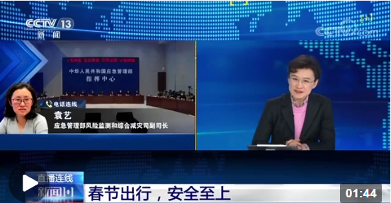 應(yīng)急管理部風(fēng)險監(jiān)測和綜合減災(zāi)司副司長 袁藝:應(yīng)急管理部高度重視春節(jié)假期的安全風(fēng)險防范工作,聯(lián)合有關(guān)部門對全國安全形勢開展了綜合研判。我們總體判斷,今年春節(jié)正好處于疫情防控轉(zhuǎn)換的關(guān)鍵期,各種不確定、不穩(wěn)定的因素明顯增多,特別是假期大規(guī)模的人員流動,高危行業(yè)的高負荷運行,大型聚集性活動、旅游活動以及燃放煙花爆竹活動大幅增多,這些都加大了安全風(fēng)險。同時春節(jié)期間還有較強的冷空氣過程影響我國,自然災(zāi)害的防范壓力也比較大。應(yīng)急管理部近日也組織召開了全系統(tǒng)調(diào)度會,要求各地強化責(zé)任意識,加強安全風(fēng)險隱患排查整治和監(jiān)督檢查,讓人民群眾過一個安全祥和的新春佳節(jié)。