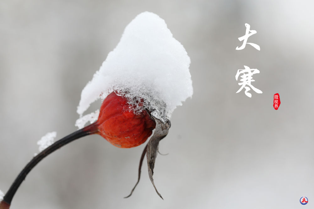 ↑河南省焦作市溫縣,月季花果實與白雪相映成趣。新華社發(fā)(徐宏星 攝)