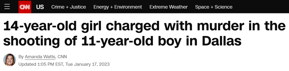 據(jù)美國有線電視新聞網(wǎng)(CNN)近日報道,美國得克薩斯州達拉斯市的一名14歲女孩在與另一名女孩的爭執(zhí)中朝對方開槍,卻意外擊中了一名旁觀的11歲男孩。目前,涉事女孩已被控謀殺罪。