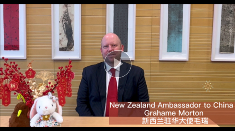 “爆竹聲中一歲除,春風(fēng)送暖入屠蘇?!毙挛魈m駐華大使毛瑞用中文讀詩(shī),為中國(guó)人民送上新春祝福。他說(shuō),春節(jié)是中國(guó)最重要的傳統(tǒng)節(jié)日,也成為一個(gè)越來(lái)越國(guó)際化的節(jié)日?!跋M蠹彝媚甏蠹?,大展宏‘兔’,前‘兔’似錦!”(視頻由新西蘭駐華大使館提供。)