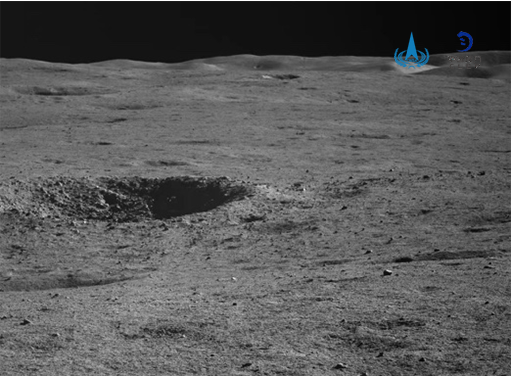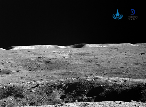 △第49月晝期間,當(dāng)玉兔二號月球車行駛至LE04905點(diǎn)時(shí),全景相機(jī)拍攝的撞擊坑邊緣隆起,遠(yuǎn)處還可以看到接著天際線的馮卡門坑邊緣。