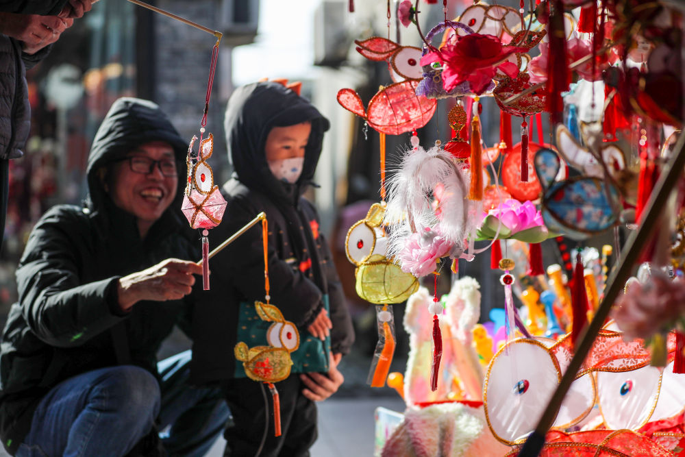 ↑1月20日,市民在江蘇揚(yáng)州東關(guān)歷史街區(qū)購(gòu)買兔子花燈。新華社發(fā)(齊立廣 攝)