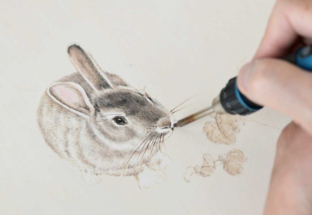 ↑1月20日,在石家莊市新華區(qū)灣里廟步行街,烙畫(huà)藝人在創(chuàng)作兔子主題的烙畫(huà)作品。新華社發(fā)(陳其保 攝)