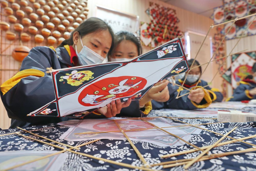 ↑1月20日,江蘇省南通市崇川區(qū)唐閘鎮(zhèn)街道與南通西藏民族中學(xué)舉辦迎新春民俗文化活動(dòng),來(lái)自西藏的學(xué)生體驗(yàn)扎制兔子主題風(fēng)箏。新華社發(fā)(許叢軍 攝)
