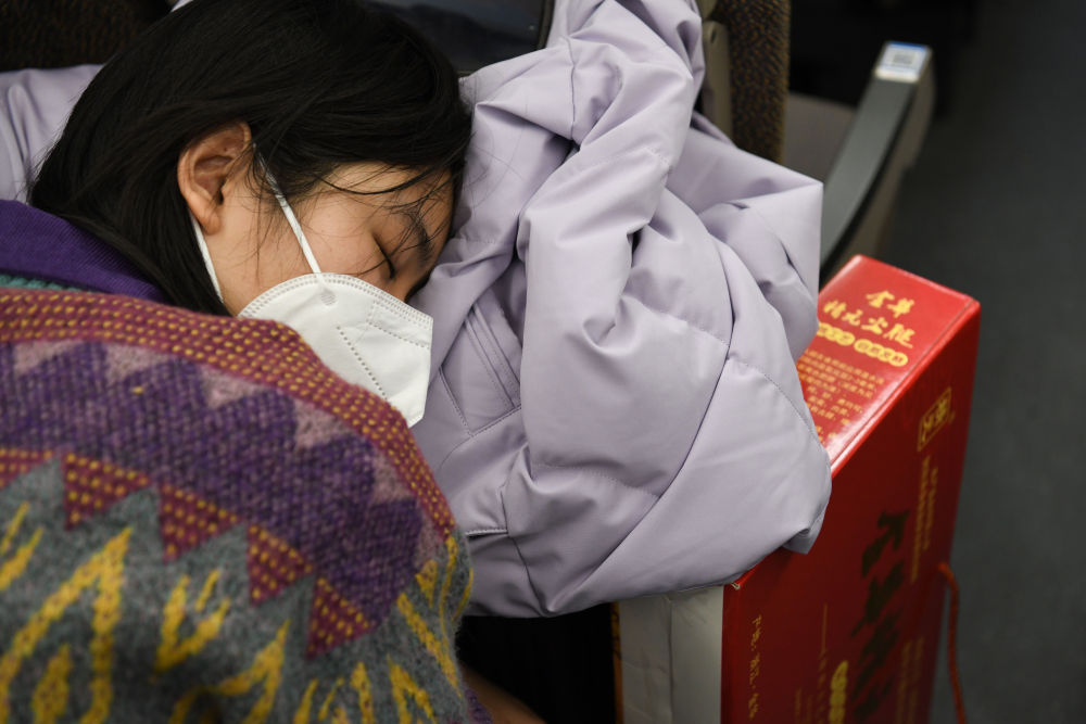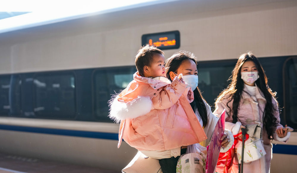 ↑ 1月7日,在貴州六盤水站,小朋友和家人準備乘車。當日,2023年春運啟動。