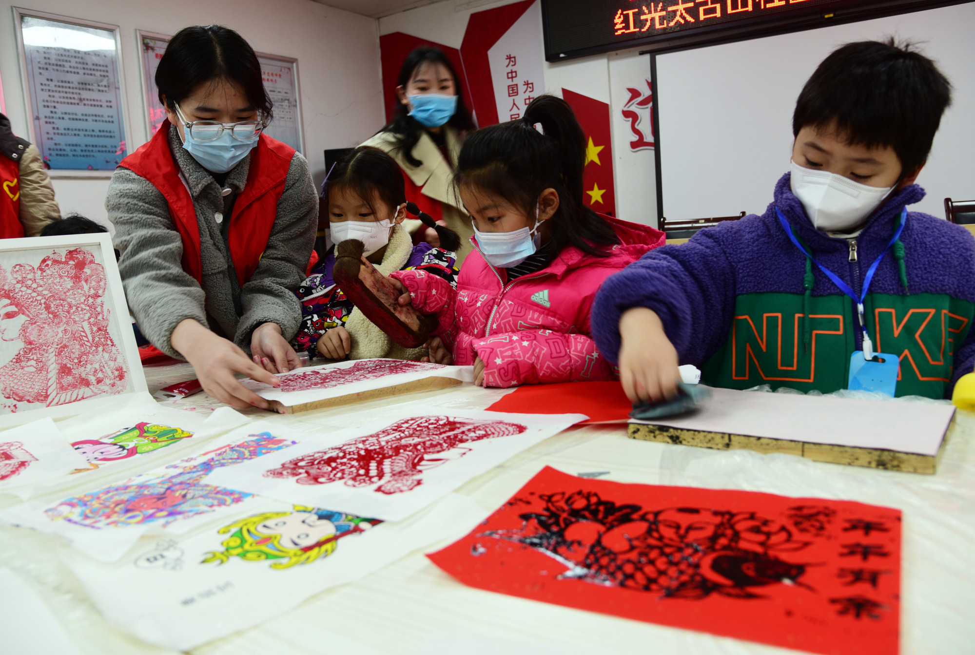 2023年1月15日,大學(xué)志愿者在江蘇省鎮(zhèn)江市紅光太古山社區(qū)指導(dǎo)小朋友拓印木版年畫。