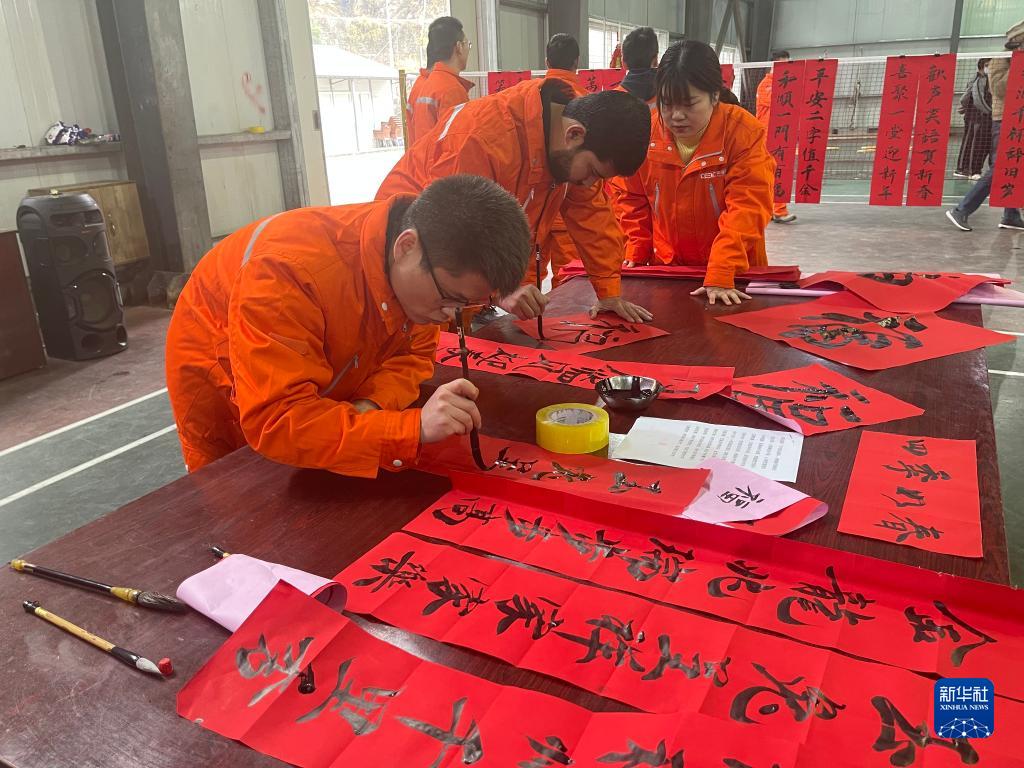 1月15日,蘇吉吉納里水電站項目工地迎新春活動現(xiàn)場,中巴員工一起用毛筆寫春聯(lián)。新華社發(fā)