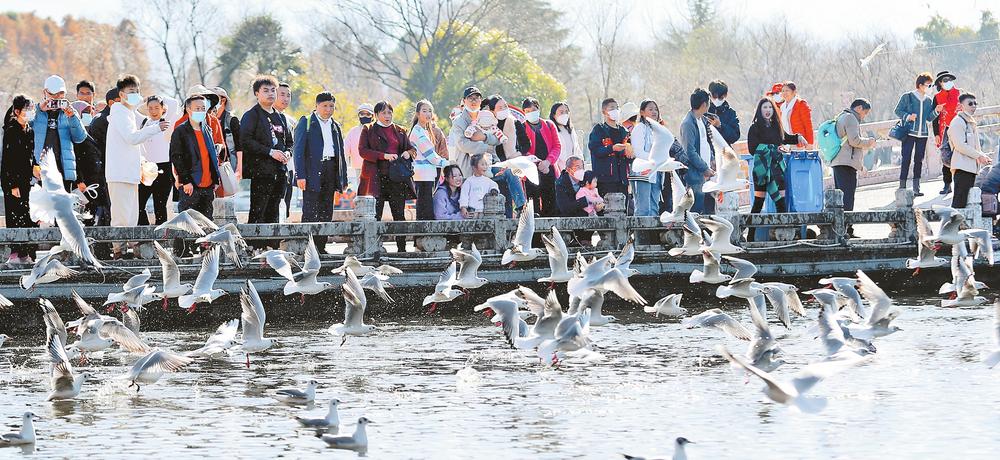 昆明大觀公園內(nèi)觀鷗喂鷗游客眾多