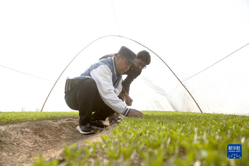 1月16日,在位于巴基斯坦旁遮普省木爾坦的中巴辣椒訂單種植項目辣椒育苗大棚內(nèi),中國農(nóng)業(yè)專家趙建華(右)帶領(lǐng)巴基斯坦技術(shù)員薩賈德查看辣椒秧苗生長情況。新華社發(fā)(艾哈邁德·卡邁勒攝)