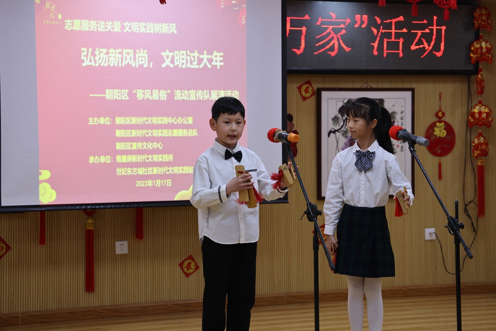 “偉大首都北京城,日新月異往前行。國泰民安多昌盛,方方面面展新容。昂首闊步齊奮斗,我們朝陽,霞光萬道披彩虹……” 農(nóng)歷臘月二十六,循著一陣陣歡快的快板說唱聲,記者來到朝陽區(qū)世紀(jì)東方城社區(qū)新時(shí)代文明實(shí)踐站“黨的聲音進(jìn)萬家 弘揚(yáng)新風(fēng)尚,文明過大年”活動(dòng)演出現(xiàn)場。北京市朝陽區(qū)新時(shí)代文明實(shí)踐“移風(fēng)易俗”流動(dòng)宣傳隊(duì)的志愿者們,正在深入宣傳黨的二十大精神,將一個(gè)個(gè)倡導(dǎo)文明新風(fēng)的原創(chuàng)節(jié)目送到社區(qū)群眾身邊,送上新春“文藝+理論”大禮包。