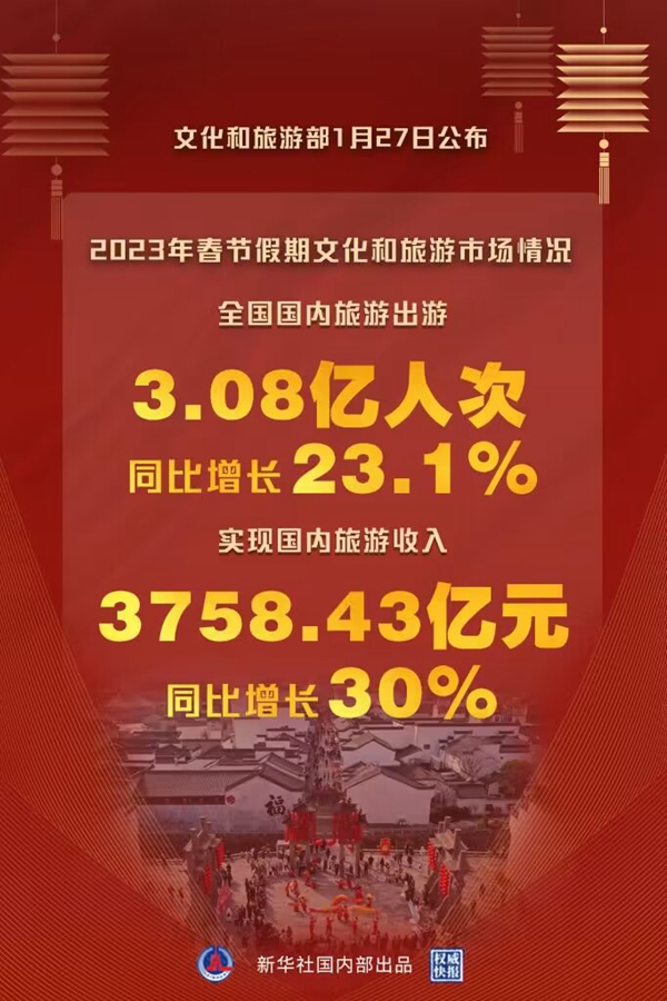 新華社北京1月27日電(記者徐壯)文化和旅游部27日公布2023年春節(jié)假期文化和旅游市場(chǎng)情況。經(jīng)文化和旅游部數(shù)據(jù)中心測(cè)算,今年春節(jié)假期全國(guó)國(guó)內(nèi)旅游出游3.08億人次,同比增長(zhǎng)23.1%。實(shí)現(xiàn)國(guó)內(nèi)旅游收入3758.43億元,同比增長(zhǎng)30%。全國(guó)文化和旅游市場(chǎng)總體安全平穩(wěn)有序。