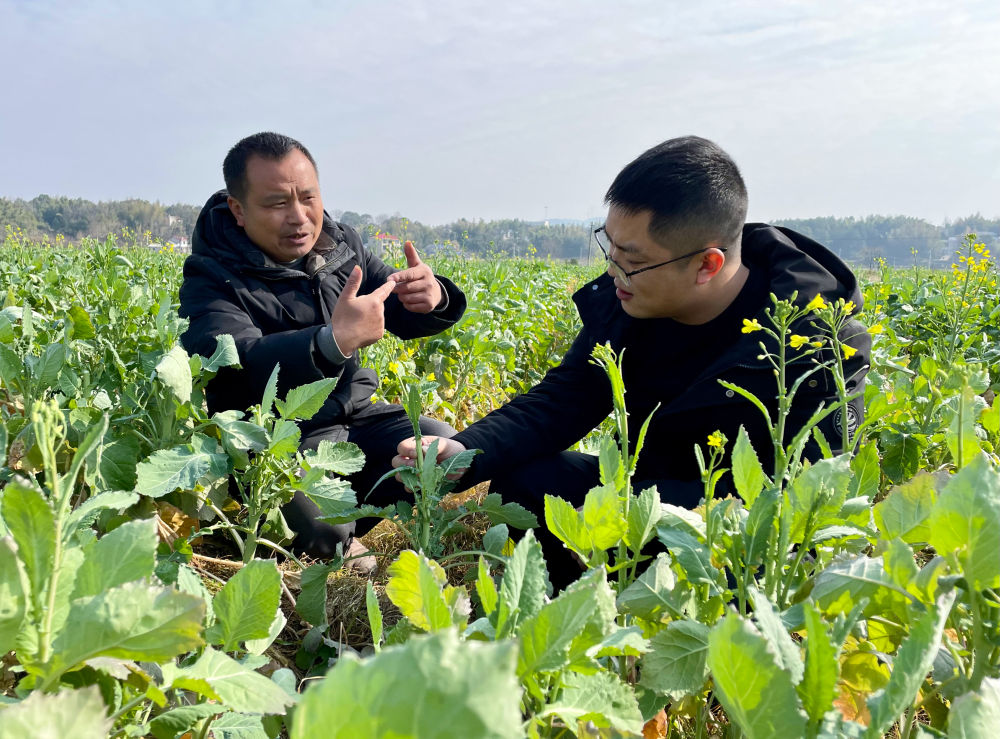 李俊德(左一)和金藪鄉(xiāng)副鄉(xiāng)長童虎軍(右一)一起仔細(xì)端詳、研究油菜長勢。新華社記者蘇曉洲 攝
