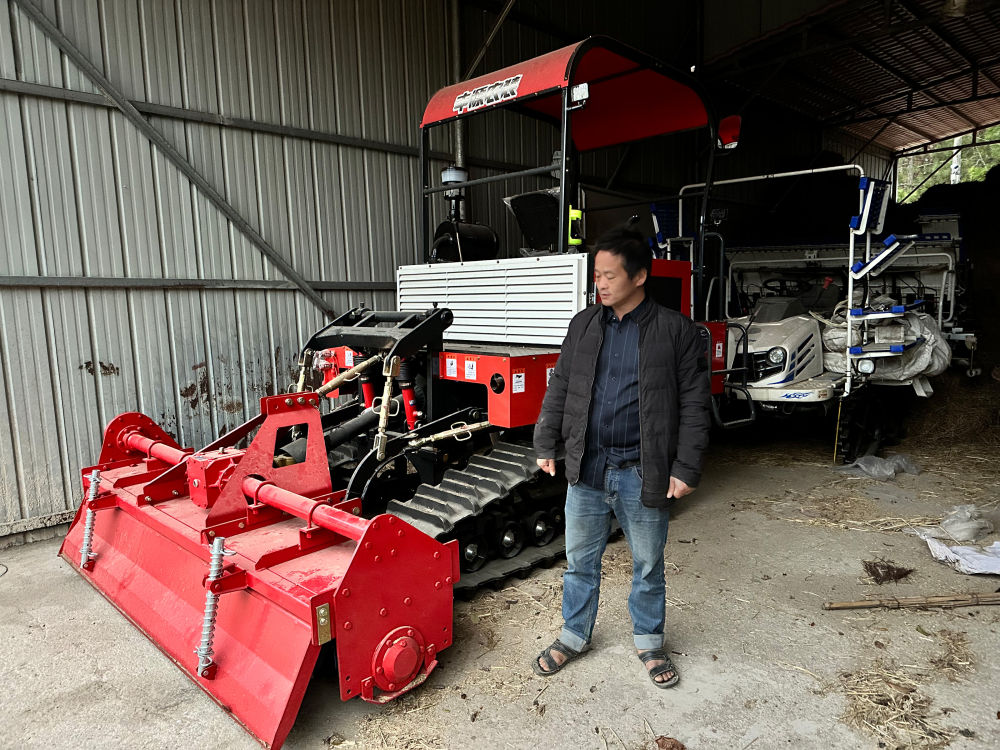 湘鄉(xiāng)市泉塘鎮(zhèn)種糧大戶舒綱舉介紹新購置的農(nóng)機(jī)。新華社記者謝奔 攝