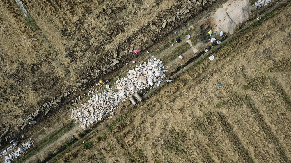 在湘鄉(xiāng)市泉塘鎮(zhèn)雙江村,工人在修建高標(biāo)準(zhǔn)農(nóng)田的機(jī)耕道(無人機(jī)照片)。新華社記者陳澤國 攝