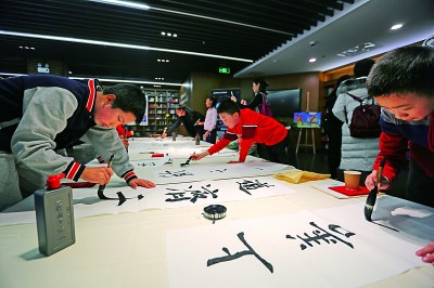 青少年參加中華思想文化術(shù)語主題書法作品評比和展覽活動。資料照片