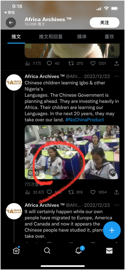 配著這段幾十秒的視頻,一個(gè)名為“Africa Archives”的賬號聲稱,這是中國孩子在學(xué)習(xí)伊博語。Africa Archives危言聳聽地說,再過20年,中國人將占領(lǐng)非洲。由于尼日利亞人大量移民到歐洲、美國、加拿大,放任中國人這樣干會(huì)讓中國在未來占領(lǐng)該國。