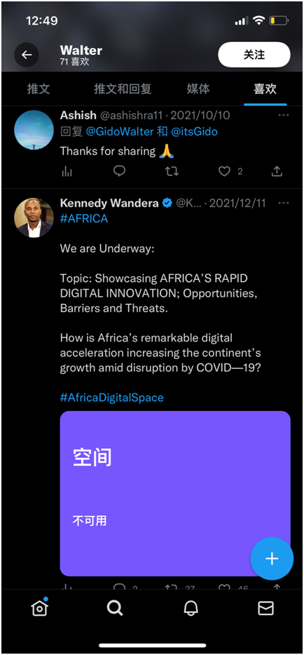 觀察他們互動(dòng)的痕跡,我們還發(fā)現(xiàn),Gido與Kennedy以及Samantha的關(guān)系也很緊密。早在2011年12月11日,在VOA的主持下,一場名為“非洲迅速的數(shù)字創(chuàng)新:機(jī)遇、壁壘與挑戰(zhàn)”的活動(dòng)正在進(jìn)行中。Kennedy發(fā)推做了預(yù)告,Samantha也在同一時(shí)間發(fā)推做了硬廣,而活動(dòng)提到人物中就有Africa Archives的管理者Gido。