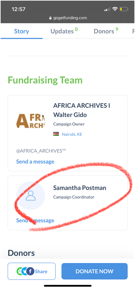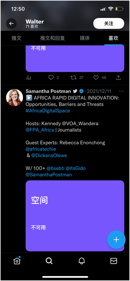 Africa Archives所謂的創(chuàng)始人Gido,在推特上有兩個(gè)代表其身份的賬號。其中一個(gè)賬號,明確關(guān)注了兩個(gè)非常有標(biāo)志性的人物,一個(gè)是VOA非洲分部的負(fù)責(zé)人Kennedy Wandera,另一個(gè)是個(gè)加拿大投資商Samantha Postman。