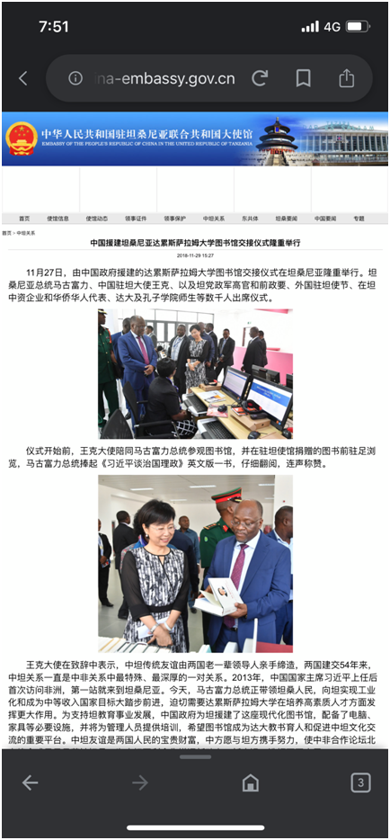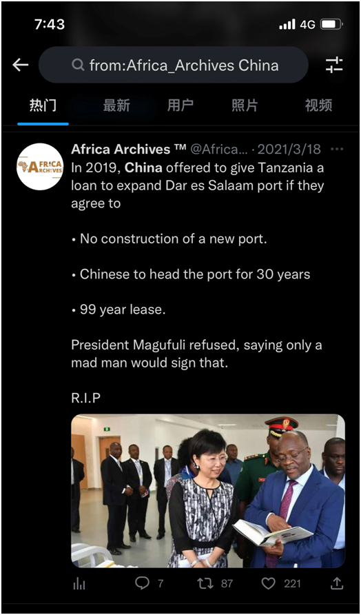 例如:在一條挑唆中國和坦桑尼亞關(guān)系的推文中,Africa Archives借著坦桑尼亞前總統(tǒng)馬古富力逝世,宣稱他2019年曾拒絕了中國的“無理要求”,稱“瘋子才會(huì)和中國簽協(xié)議”。然而,配圖卻是中國援建坦桑尼亞達(dá)累薩拉姆大學(xué)圖書館的交接儀式上,王克大使和馬古富力總統(tǒng)的親切互動(dòng)。
