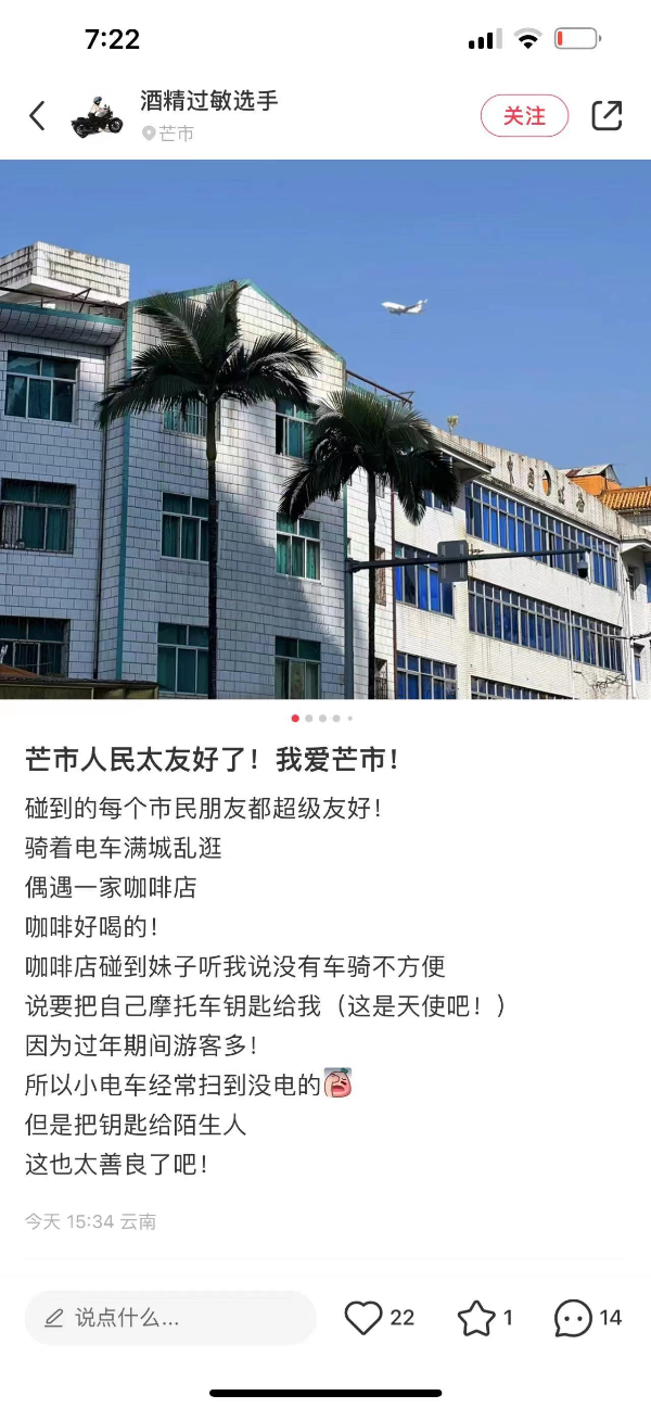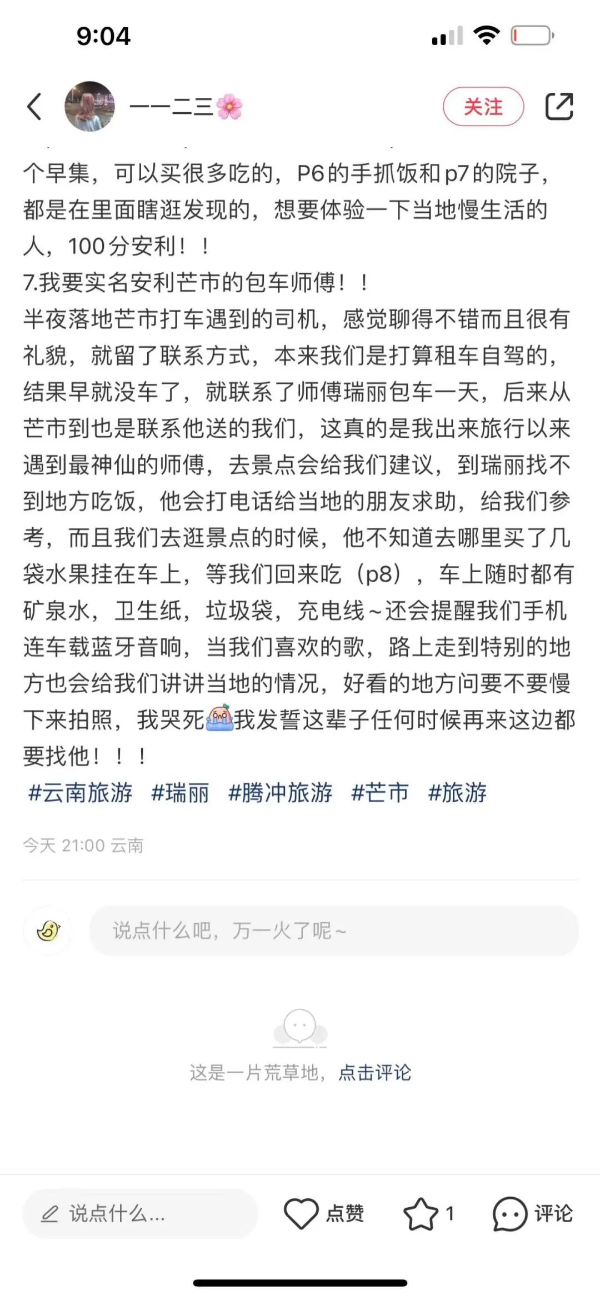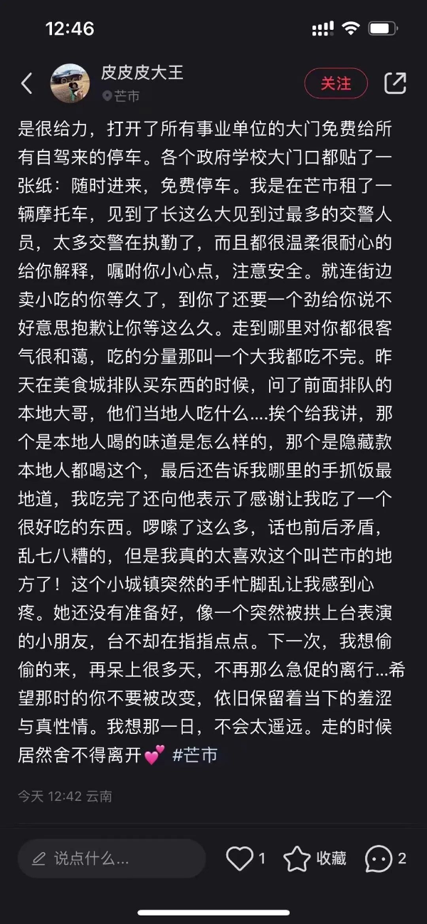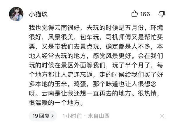 山西網友“小貓玖”留言:“我也覺得云南很好,去玩的時候是五月份,環(huán)境很好,風景很美,包車玩。走的時候司機師傅給我們買了好多本地的玉米,雞蛋,那個味道也讓人很想念呀。云南是讓我還想一直再去的地方。很熱情,很溫暖的一個地方?!?/p>