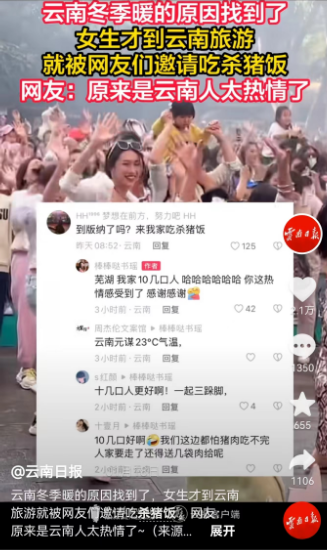 杭州游客才到云南旅游,就收到了無數云南人的邀請。“快來我家吃殺豬飯”“到了版納別忘了來我們寨子吃肉”……女孩留言稱,云南人就像這里的天氣一樣溫暖。
