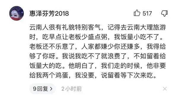 網友“惠澤芬芳2018”留言稱,云南人很有禮貌特別客氣,“記得去云南大理旅游時,吃早點老板非要給我兩個雞蛋,我沒要,說留著等下次來吃?!?/p>