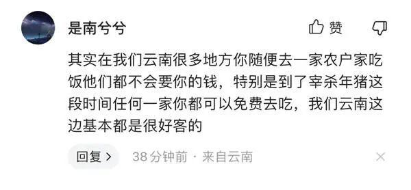 云南網友“是南兮兮”留言表示,其實在我們云南很多地方你隨便去一家農戶家吃飯他們都不會要你的錢,特別是到了宰殺年豬這段時間任何一家你都可以免費去吃,我們云南這邊基本都是很好客的。