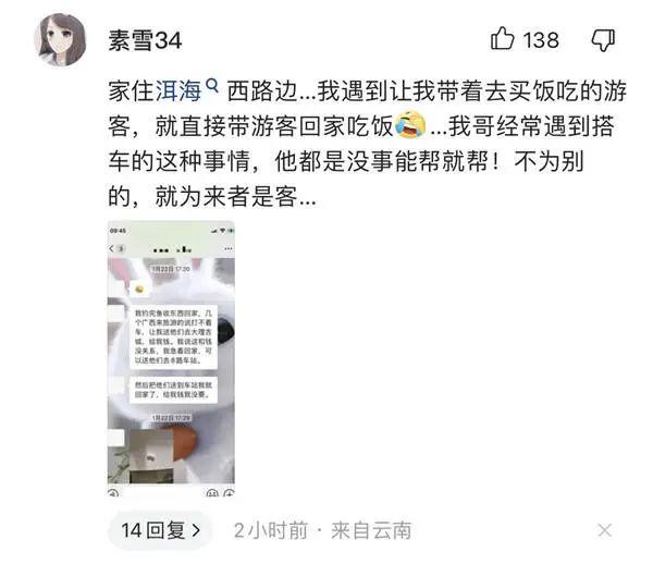 來自大理的網友“素雪34”留言:“家住洱海西路邊……我遇到讓我?guī)еベI飯吃的游客,就直接帶游客回家吃飯......我哥經常遇到搭車的這種事情,他都是沒事能幫就幫!不為別的,就為來者是客…...”
