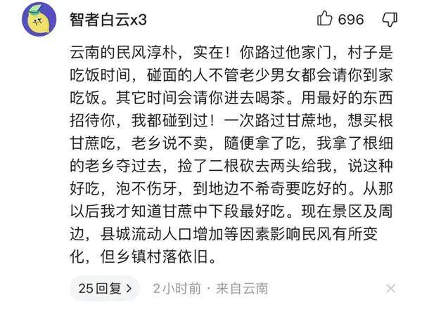 “云南的民風淳樸,實在!一次路過甘蔗地,想買根甘蔗吃,老鄉(xiāng)說不賣,隨便拿了吃,我拿了根細的老鄉(xiāng)奪過去,撿了二根砍去兩頭給我,說這種好吃,泡不傷牙。從那以后我才知道甘蔗中下段最好吃?!本W友“智者白云x3”留言說。