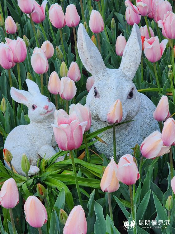 在一片“重瓣小黑人”郁金香花海中,園丁們特意拼出了“2023”圖案;而在“肉色印象”花海中,幾只栩栩如生的“小白兔”駐足其中,它們也被這片壯美的郁金香花田所吸引,仰著頭欣賞,久久不忍離開。