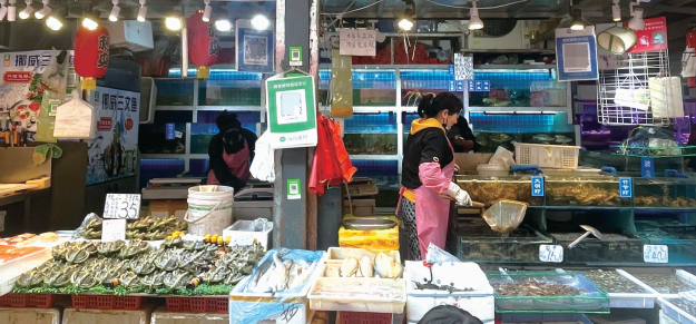 篆新農(nóng)貿(mào)市場(chǎng)一海鮮攤位,貨品琳瑯滿目